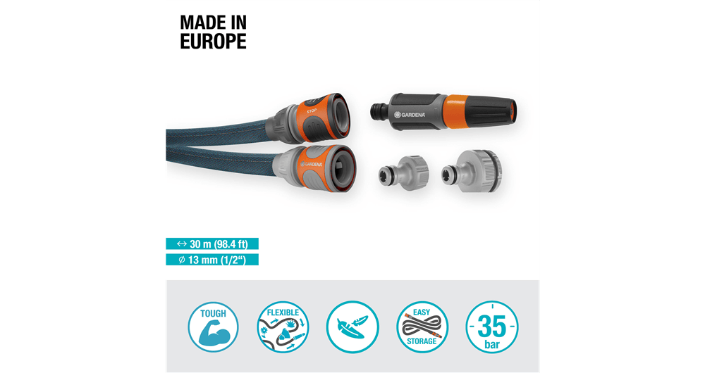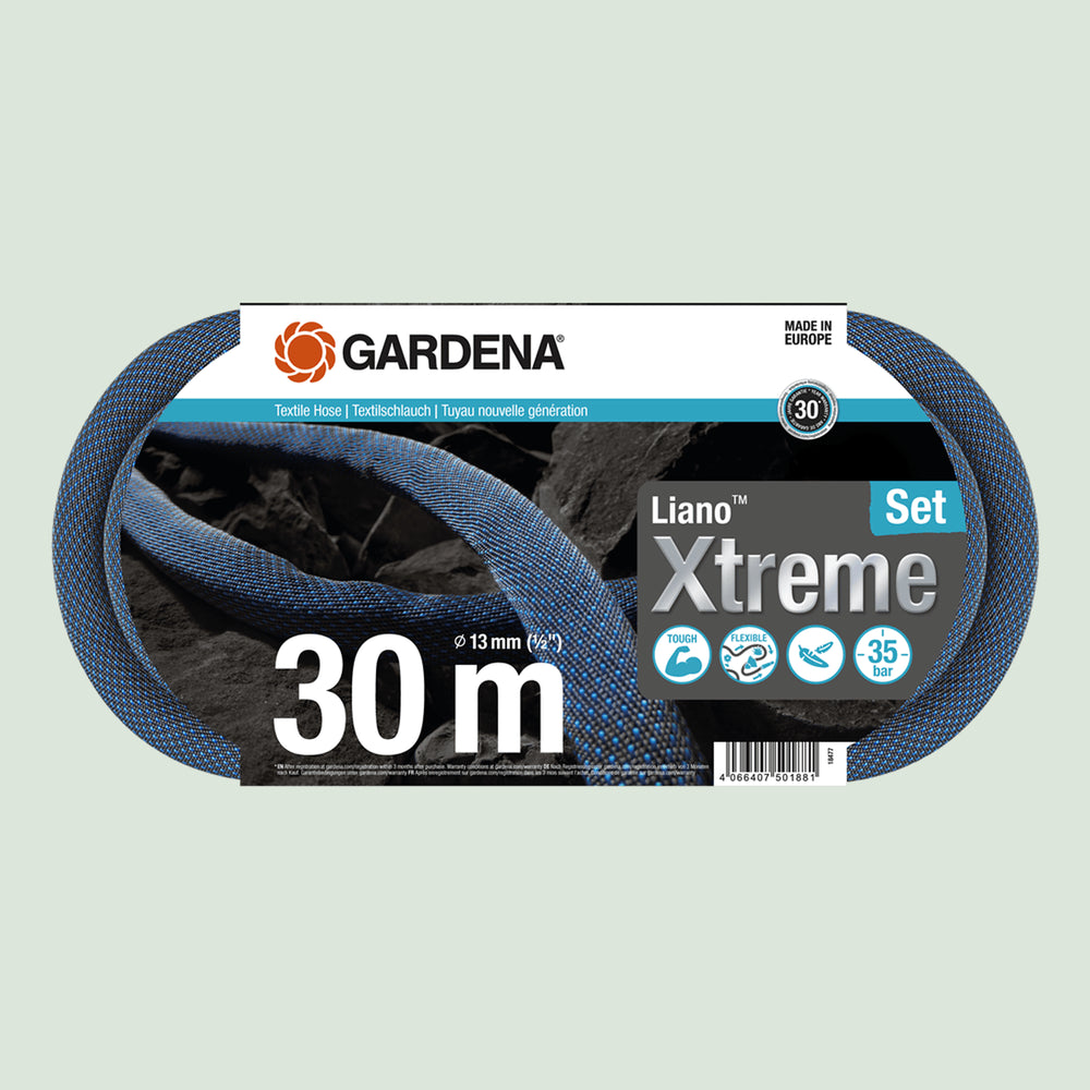 Tekstilslange Liano™ Xtreme 30 m Sett fra GARDENA gir deg alt du trenger for praktisk og utfordrende vanning i hagen. Den 30 meter lange tekstilslangen, med en diameter på 13 mm (1/2"), er skapt for daglig bruk og utfordrende vanning. Settet inneholder en ferdigmontert Liano™ slangekobling, Liano™ vannstopper, rengjøringsdyse, veggoppheng og to krankoblinger, hvorav den ene har en integrert reduksjonsskjøt for tilkobling til tre ulike kranstørrelser.