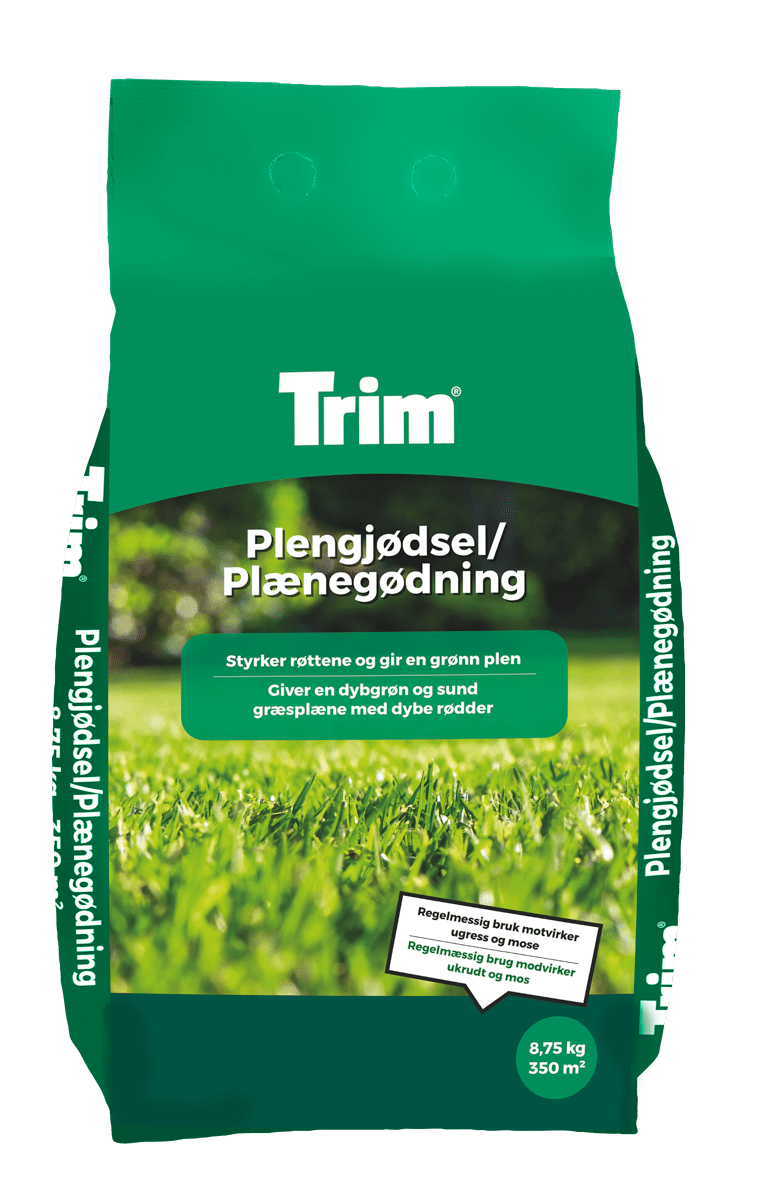 Drømmen om en flott og grønn plen kan bli til virkelighet med Trim Plengjødsel. Produktet er godt tilpasset gressvekst med hensyn til næringsstoffer, og du vil raskt kunne se et pent resultat. I tillegg til en slitesterk, flott og grønn plen, vil gjødselen bidra til langsommere vekst samt et kraftig og dypt rotnett. Produktet motvirker også mose og vil gjøre gresset mer tørketolerant. Pass i tillegg på at du ikke klipper gresset kortere enn 3,5– 5 cm, slik at det alltid har best mulige vekstforhold. Trim er opptatt av naturen og å kunne bidra til miljøet, derfor bør du være ditt ansvar bevisst og velge gode, naturlige kvalitetsprodukter fra oss.