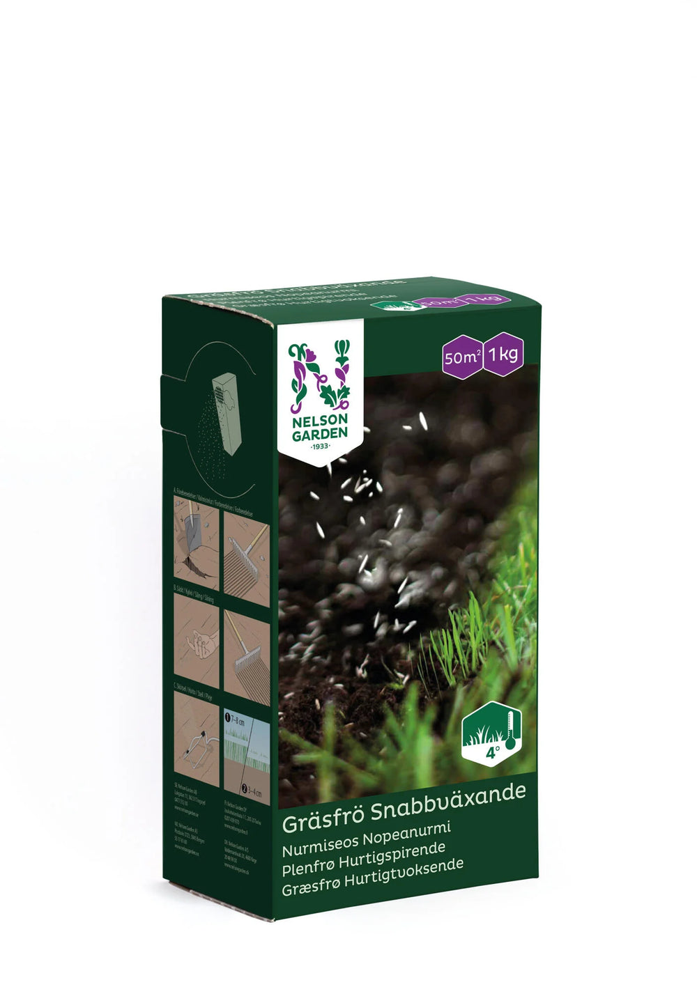 Nelson Gardne Hurtigspirende Plenfrø er en raskt spirende blanding av plenfrø som spirer innen én uke under optimale forhold og allerede ved 4°C. Denne blandingen vokser raskt og utvikler en slitesterk gressplen. Dette gjør den ideell for områder som trenger rask etablering og vedlikehold av en robust plen.